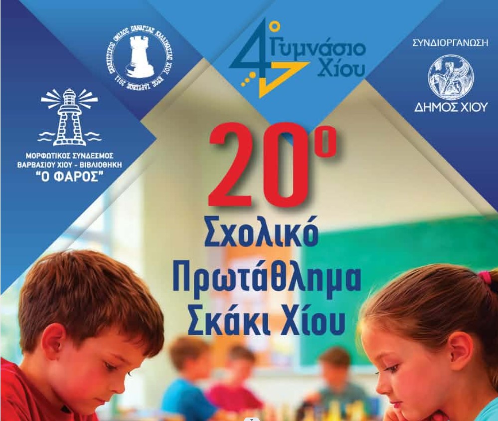 Στις 29 Μαρτίου το 20ό Σχολικό Πρωτάθλημα Σκάκι Χίου Το 20ό Σχολικό Πρωτάθλημα Σκάκι Χίου 2026 θα πραγματοποιηθεί την Κυριακή 29 Μαρτίου 2026 στις αίθουσες του 4ου Γυμνασίου Χίου, με ώρα έναρξης τις 10:00 το πρωί, συγκεντρώνοντας μαθητές και μαθήτριες από όλες τις βαθμίδες εκπαίδευσης του νησιού. Η διοργάνωση πραγματοποιείται από το 4ο Γυμνάσιο Χίου, τον Σκακιστικό Όμιλο Παναγίας Καλλιμασιάς Χίου και τον Μορφωτικό Σύνδεσμο Βαρβασίου Χίου – Βιβλιοθήκη «Ο Φάρος», με τη στήριξη του Δήμου Χίου. Στο πρωτάθλημα έχουν δικαίωμα συμμετοχής μαθητές και μαθήτριες νηπιαγωγείων, δημοτικών σχολείων, γυμνασίων…